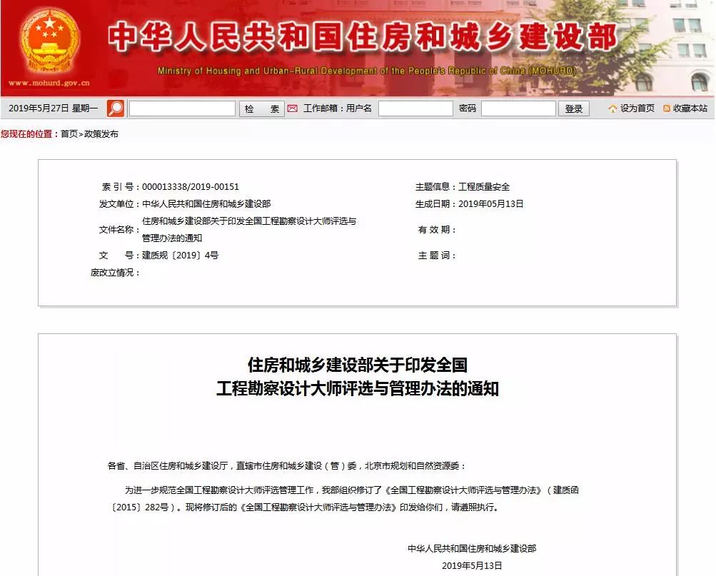 住房和城乡建设部克日发出通知,宣布了新修订的《天下工程勘探设计巨匠评选与管理步伐》,同时决议开展第九批天下工程勘探设计巨匠评选事情。