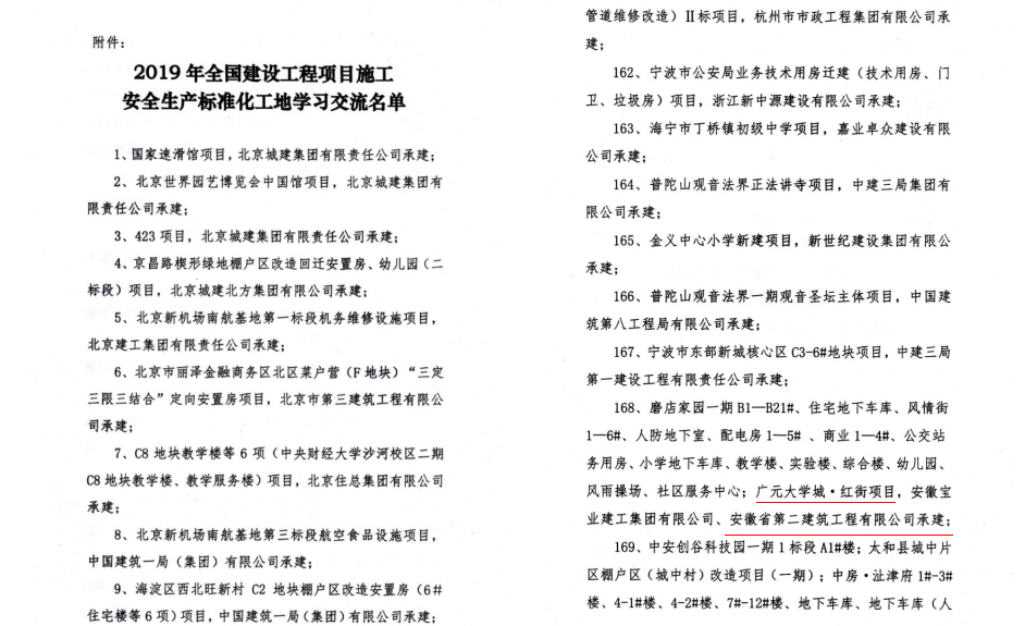 克日,从中国修建业协会及安徽省建设行业质量与清静协会获悉,安徽二建公司承建的广元大学城·红街项目荣获2019年度国建设工程清静生产最高奖“天下建设工程项目施工清静生产标准化工地”称呼,尚有临泉汇鑫悦澜湾、固镇名邦国际花都、岳西润业国际电商工业园、宣城利华世纪新城三期、临泉县一品公馆小区、阜阳新城吾悦广场4#地块1-A标段、淮北恒基城-建元新河、江西萍乡学府湖畔8个项目荣获2019年度“省级修建清静生产标准化树模工地”称呼,为公司再添声誉。