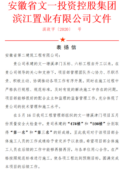 安徽二建文一·塘溪津门五标项目管理团队坚持疫情防控与复工复产两手抓、两手硬,管理团队同心协力、尽职尽责、起劲自动,保质保量完成施工使命。在5月16日安徽省文一投资控股集团滨江置业有限公司工程管理部组织的五月份质量清静大检查中,“47#楼”取得第一名的好效果,获建设单位转达表扬。