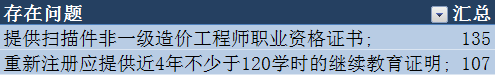 通太过析不切合条件职员的问题发明,保存“提供扫描件非一级造价工程师职业资格证书”、“重新注册应提供近4年不少于120学时的继续教育证实”这两大问题的职员较多,划分为135人和107人,占所有不切合初始注册条件人数的49.2%。