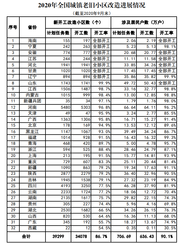 2020年1-9月份天下城镇老旧小区刷新希望情形如下