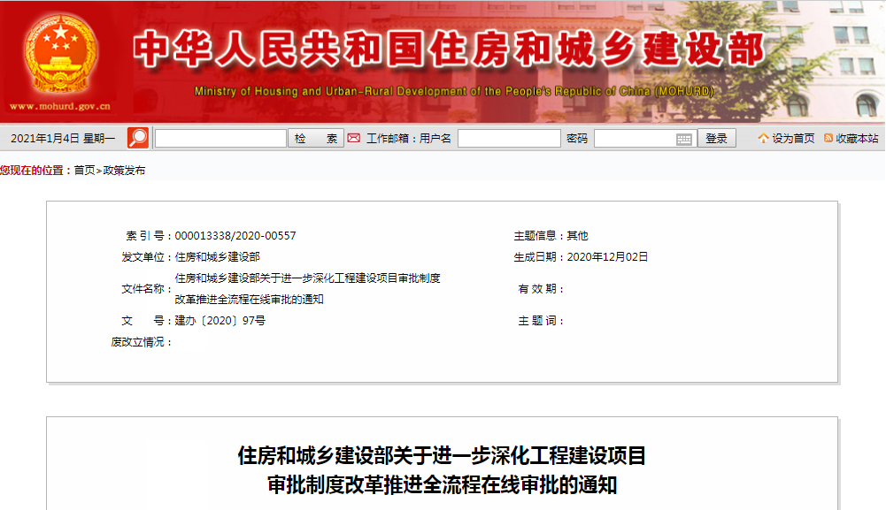 住房和城乡建设部印发通知 要求进一步深化工程建设项目审批制度刷新推进全流程在线审批